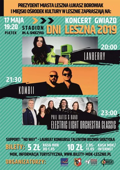 Prezydent Miasta Leszna Łukasz Borowiak, Miejski Ośrodek Kultury oraz Miejski Ośrodek Sportu i Rekreacji w Lesznie zapraszają na Dni Leszna na Stadionie im. Alfreda Smoczyka w Lesznie. Koncert gwiazd na "Smoku" dnia 17 maja 2019r. (piątek) tradycyjnie rozpoczyna weekend wydarzeń kulturalnych podczas obchodów Dni Leszna. Na rozgrzewkę o godzinie 19:20 zagrają dla Was laureaci X Jubileuszowej edycji Konkursu Talentów "Rozwiń Skrzydła" 2018 - zespół No Way.
