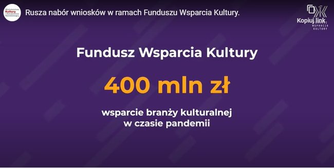 Ruszył długo oczekiwany Fundusz Wsparcia Kultury, czyli pomoc finansowa ze strony polskiego rządu kierowana do sektora kultury. Jego budżet to 400 mln zł, a do wsparcia uprawnione są samorządowe instytucje artystyczne, organizacje pozarządowe i przedsiębiorcy prowadzący działalność kulturalną w dziedzinie teatru, muzyki i tańca.