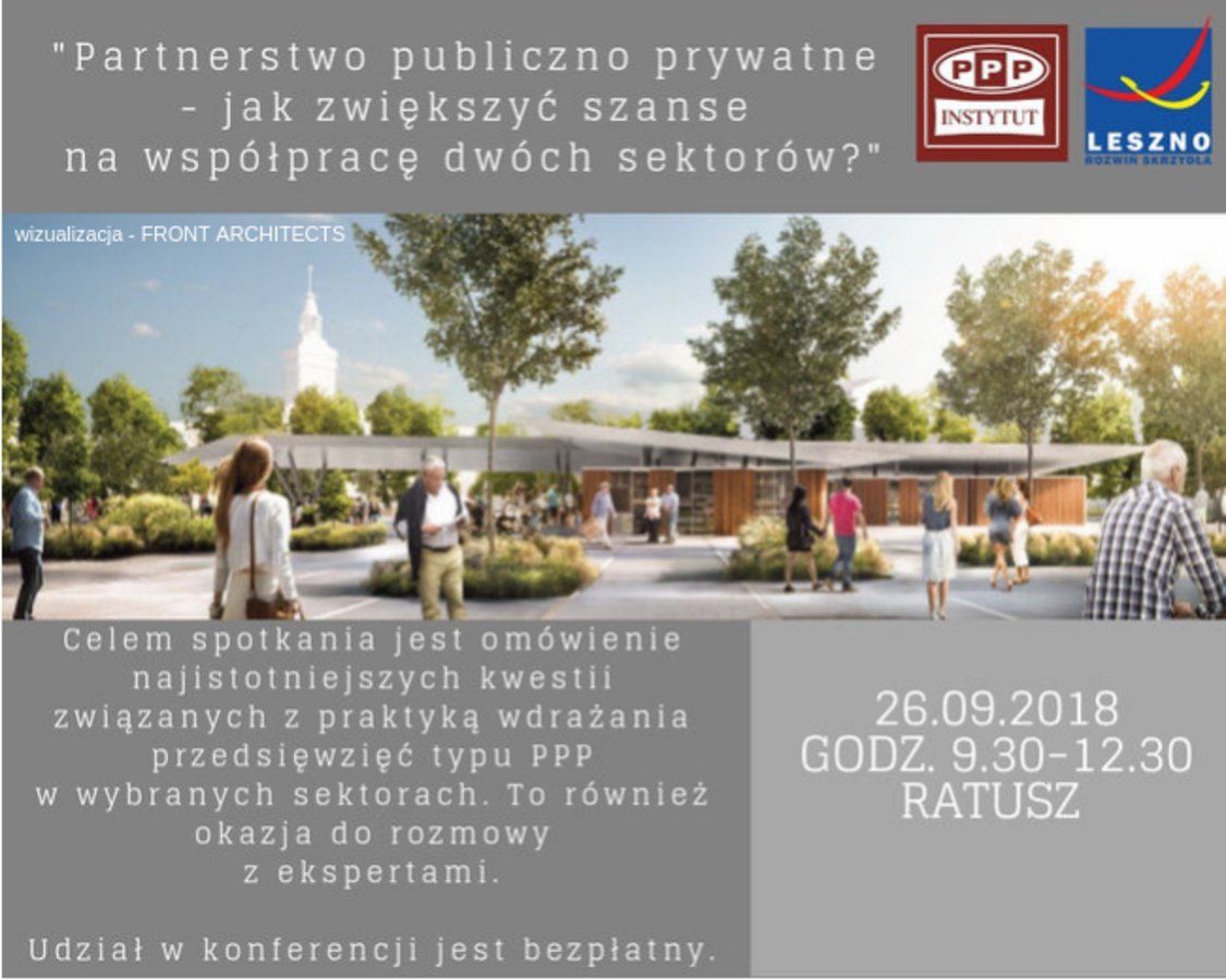 Prezydent Miasta Leszna zaprasza zainteresowanych przedsiębiorców na konferencję pt. "Partnerstwo Publiczno Prywatne - jak zwiększyć szanse na współpracę dwóch sektorów?", która odbędzie się 26 września w Ratuszu (9.00-12.30).