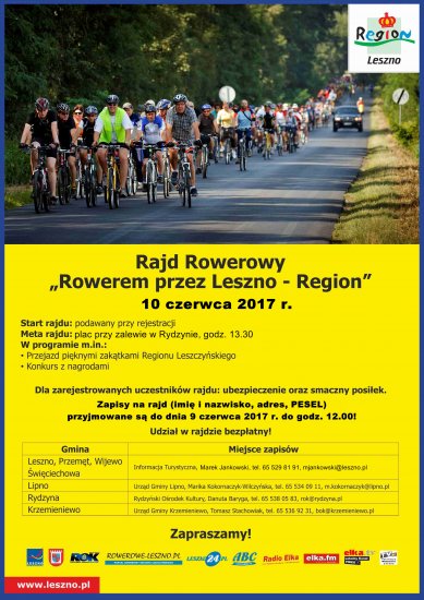 Trasa Rajdu „Rowerem przez Leszno-Region” prowadzić będzie z terenu gmin zrzeszonych w Organizacji Turystycznej Leszno – Region. Grupy rowerzystów wyjadą z Leszna, Rydzyny, Krzemieniewa i Lipna, by spotkać się na mecie, która znajduje się przy zalewie w Rydzynie. Tam wszyscy uczestnicy zjedzą ciepły posiłek. Dodatkowymi atrakcjami na mecie będą także konkursy z nagrodami .